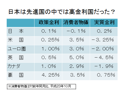 名目金利は最低水準であったのに、実質金利はオーストラリアに次いで2番目に高い。なぜなら、わが国の物価だけが恒常的に下落し続けるデフレになっているからである。