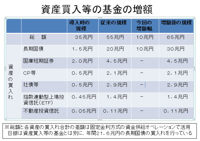 表にあるように、2010年10月に日本銀行が導入した「包括緩和」では、長期国債以外に、社債、ETF(指数連動型上場投資信託)、不動産投資信託(Jリート)などに多岐に渡っていた点も大きな違いと言えるでしょう。