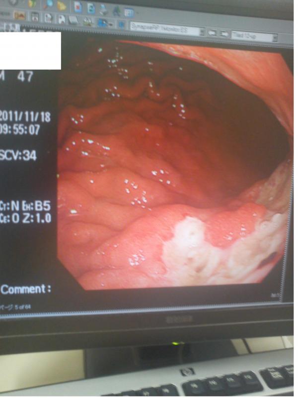 実は、その白いところは胃潰瘍です。周りをふくめてガン細胞におかされた結果、胃壁が胃酸に負けて潰瘍になってしまったわけです。
