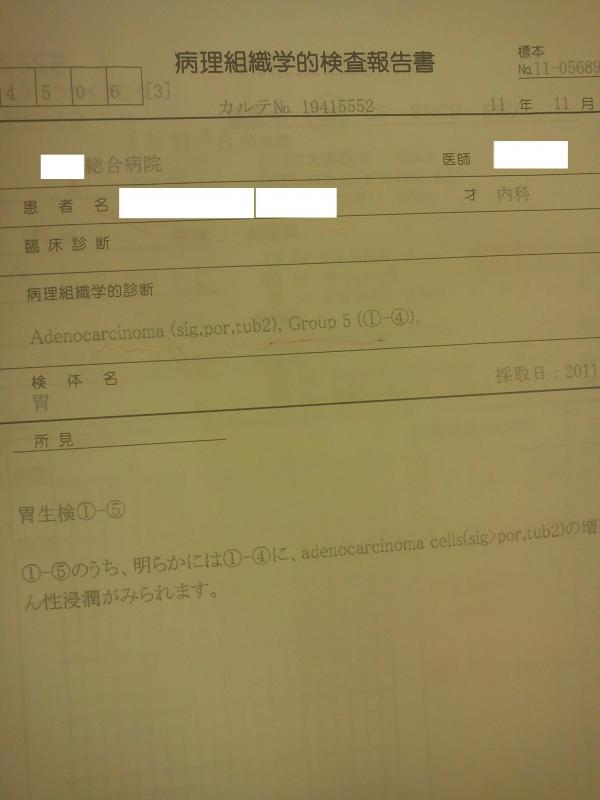 と、いうわけでみごとガン告知されました。わかってはいてもインパクトありました。ステージⅡ~Ⅲ以上の進行性胃ガンでした。
