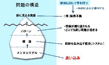 この図にあるように、目に見える問題現象(例えば発熱や販売不振)が続くとすれば、その下には「問題を生み出す構造」があるというわけだ。