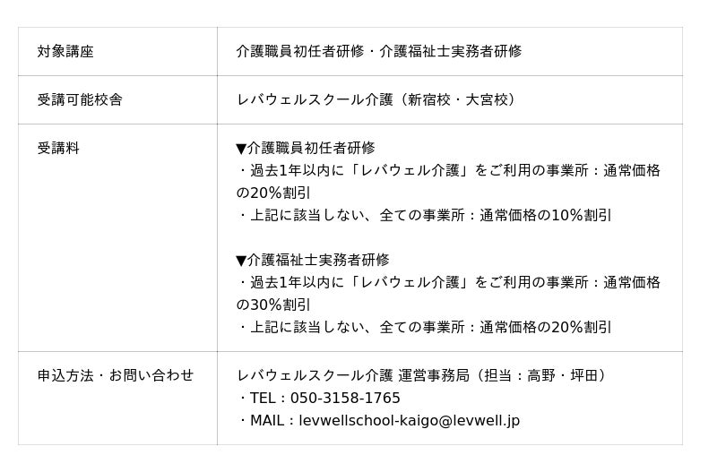 こうした背景を受け「レバウェルスクール介護」では、事業所向けに受講料を通常価格から最大30%割引する「介護職員資格取得支援プラン」を新たに提供開始いたします。本プランを通じて、外国人材を含めた資格取得を目指す職員への学習支援と事業所の負担軽減を両立し、資格取得支援の取り組みを後押しします。