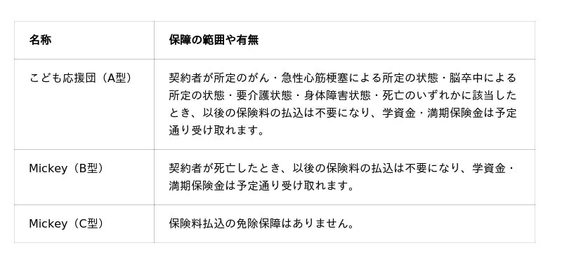 さらに、契約者のもしもに備える「保険料払込の免除保障」を用意しており、その保障の範囲や有無によって3つの型から選べます。