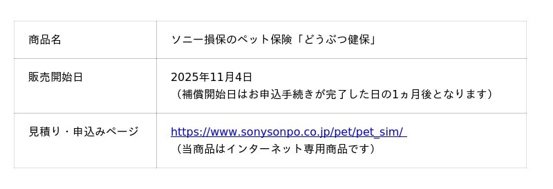 ソニー損害保険株式会社(代表取締役社長:坪田 博行、本社:東京都大田区、以下「ソニー損保」)と、アニコム損害保険株式会社(代表取締役:野田 真吾、本社:東京都新宿区、以下「アニコム損保」)は、ペットと共生する社会の実現に向けて、2025年11月4日より共同でペット保険の販売を開始しましたので、お知らせします。