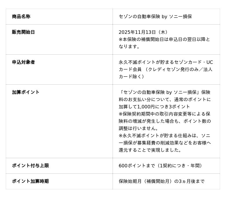 株式会社クレディセゾン(本社:東京都豊島区、代表取締役(兼)社長執行役員 COO:水野 克己、以下:クレディセゾン)と、ソニー損害保険株式会社(本社:東京都大田区、代表取締役社長:坪田 博行、以下:ソニー損保)は、クレディセゾン発行のセゾンカード・UCカード会員様を対象に、永久不滅ポイントが最大4倍貯まる「セゾンの自動車保険 by ソニー損保」の提供を2025年11月13日(木)より開始いたします。