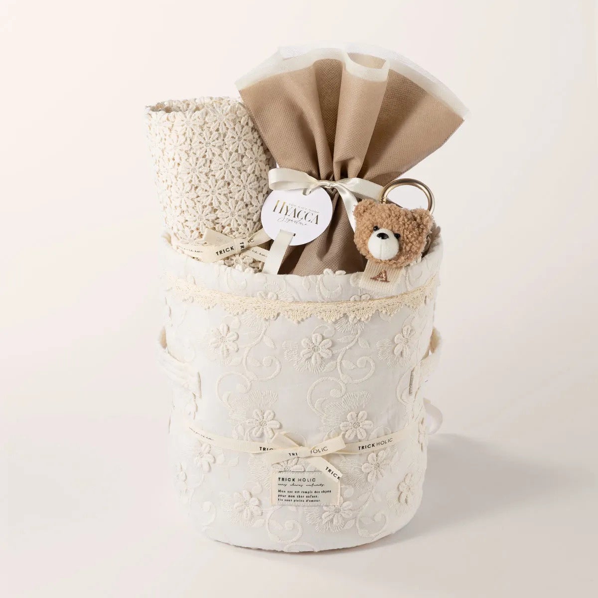 〈トリックホリック〉のストレージバッグに、イニシャルタグ、ブランケット、おむつを詰め合わせた特別セットです。立体感のある花の刺繍を施したバッグは、おむつを使い切った後もインテリア収納として活用可能。日常の使いやすさと装飾美を兼ね備えています。