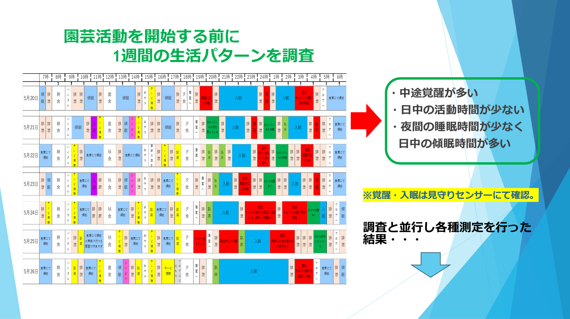 見守りセンサーのデータから、日中の傾眠や夜間の中途覚醒が減少するなど、生活リズムの安定が確認された。