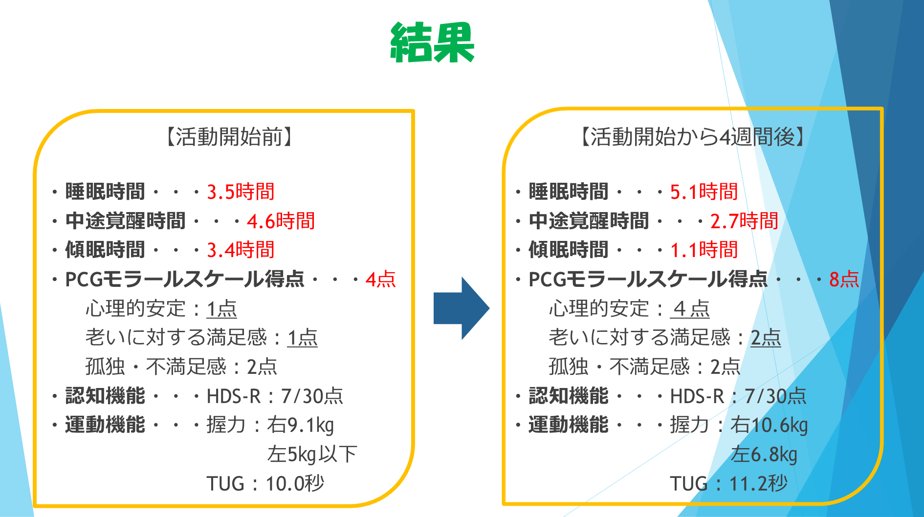 ・心理・身体・認知の評価(PCGモラールスケール、HDS-R、TUG、握力)
