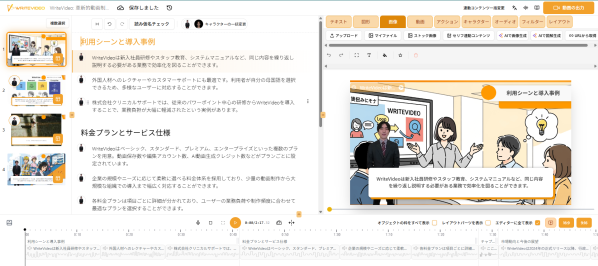 編集画面では、修正した台本をもとに、日本語ナレーション付きの動画として仕上げていきます。