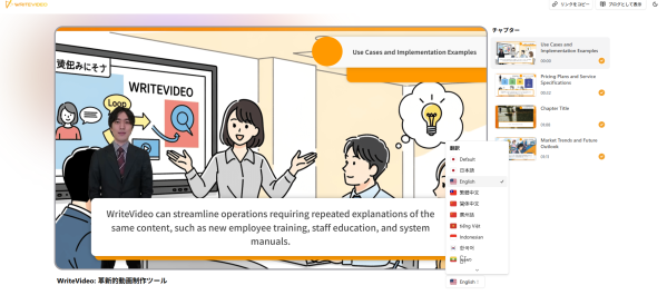 日本語で作成した構成と台本をもとに、英語を含む多言語ナレーション動画を作成できます。