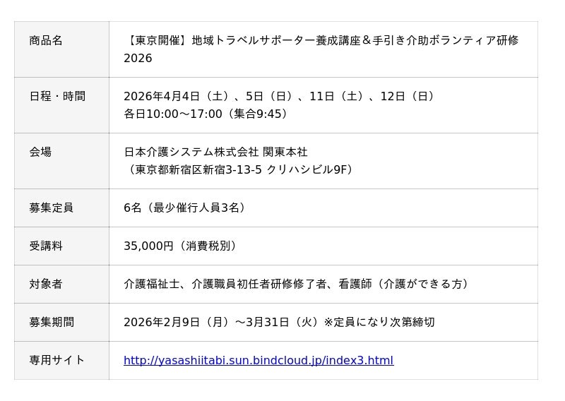 日本介護システム株式会社(本社:大阪市、代表取締役社長:大友俊雄)は、要介護高齢者や視覚障害者など、移動や外出に不安を抱える方々が、地域の中で安心して旅行や日常の外出を楽しめる環境づくりを目的とした介護・医療専門職向け人材育成プログラム「地域トラベルサポーター養成講座&手引き介助ボランティア研修2026」を、2026年4月より開講いたします。