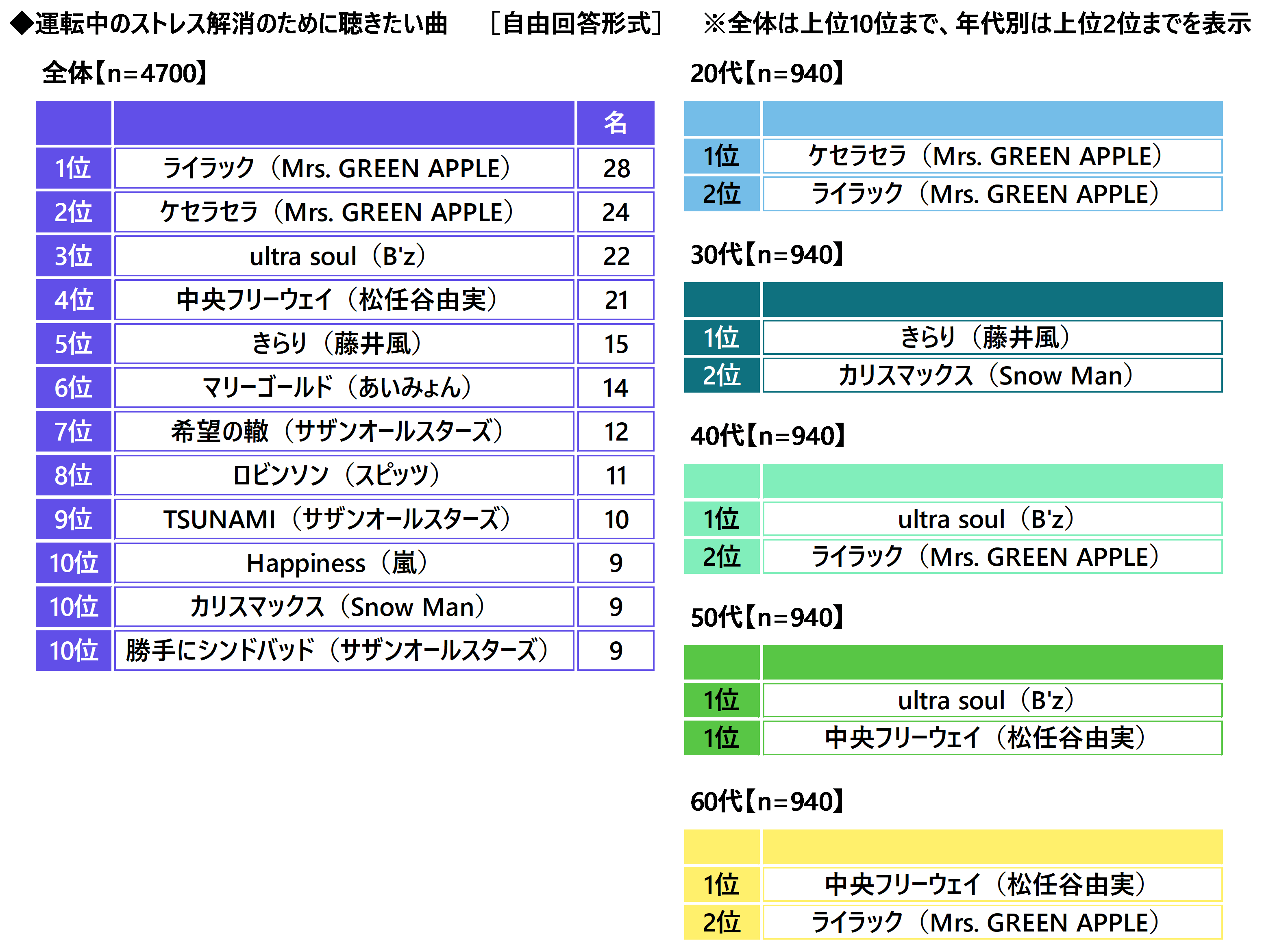 年代別にみると、20代では「ケセラセラ(Mrs. GREEN APPLE)」、30代では「きらり(藤井風)」、40代では「ultra soul(B'z)」、50代では「ultra soul(B'z)」「中央フリーウェイ(松任谷由実)」、60代では「中央フリーウェイ(松任谷由実)」が1位でした。