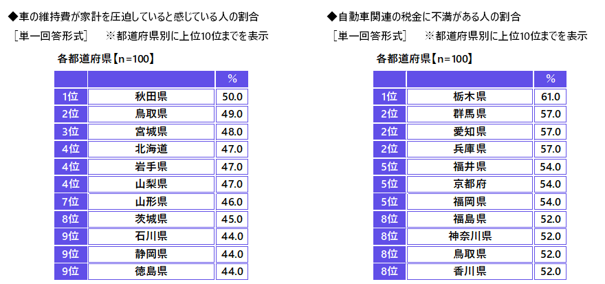 車の維持費が家計を圧迫していると感じている人の割合を都道府県別にみると、1位は秋田県(50.0%)、2位は鳥取県(49.0%)、3位は宮城県(48.0%)でした。