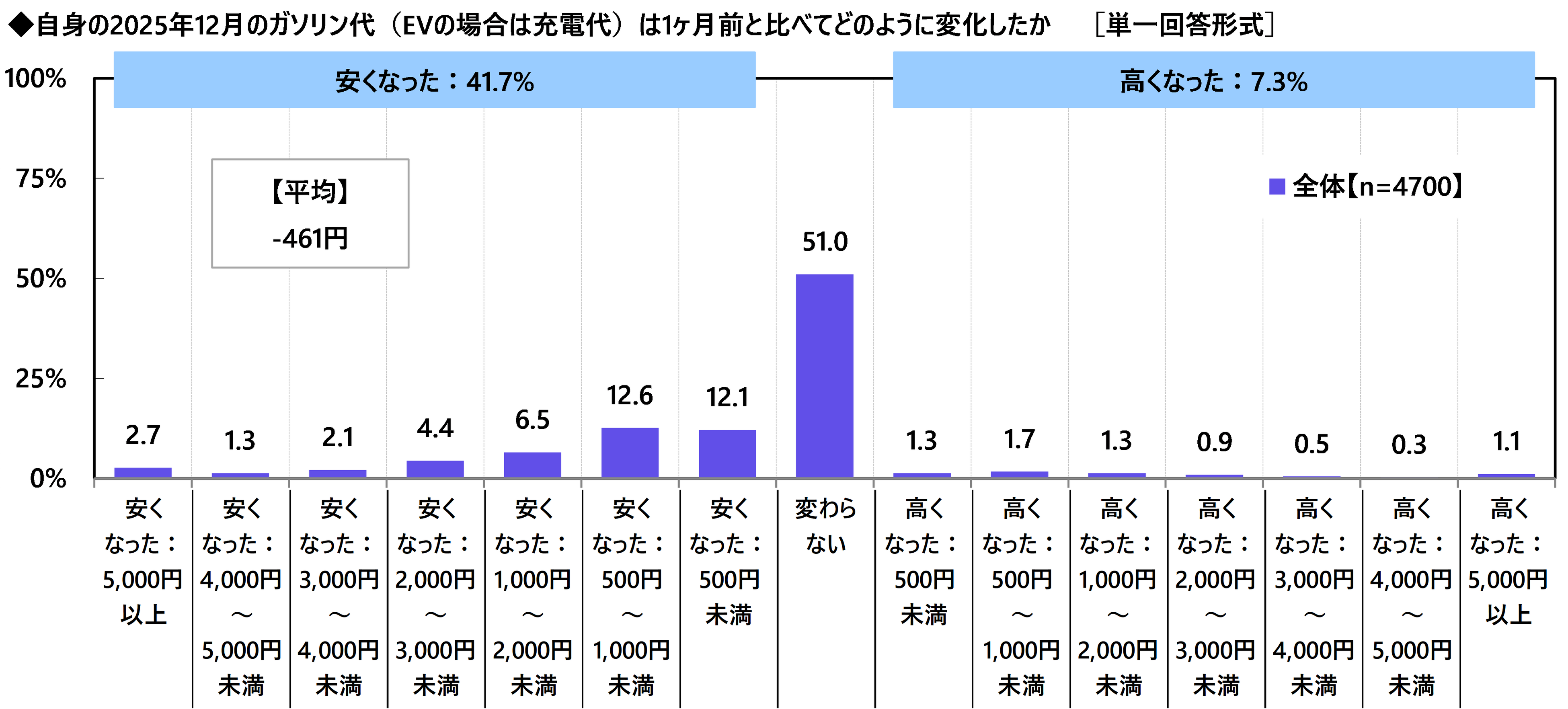 自身の2025年12月のガソリン代(EVの場合は充電料金)は1ヶ月前と比べてどのように変化したか聞いたところ、「安くなった」は41.7%、「変わらない」は51.0%、「高くなった」は7.3%となり、平均は-461円(461円安くなった)でした。