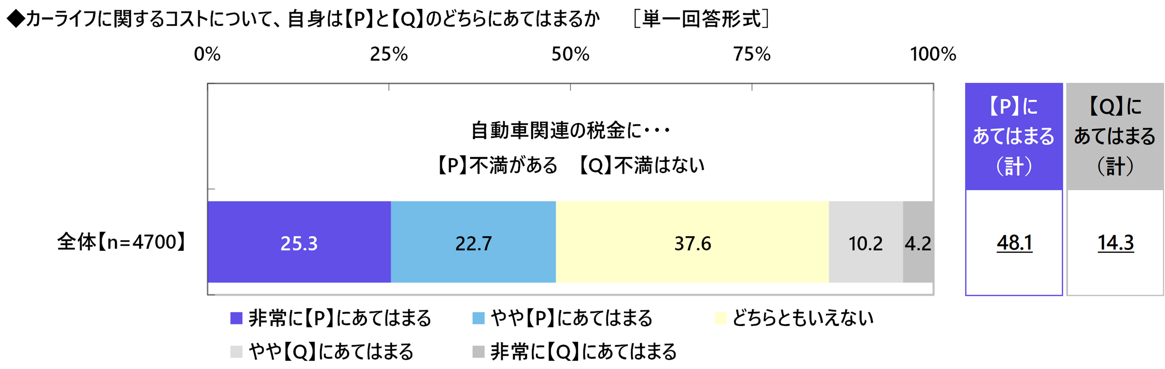 ≪自動車関連の税金に…不満がある 不満はない≫では、『不満がある(計)』は48.1%、『不満はない(計)』は14.3%、「どちらともいえない」は37.6%と、自動車関連の税金に対し納得していない人が多い結果となりました。