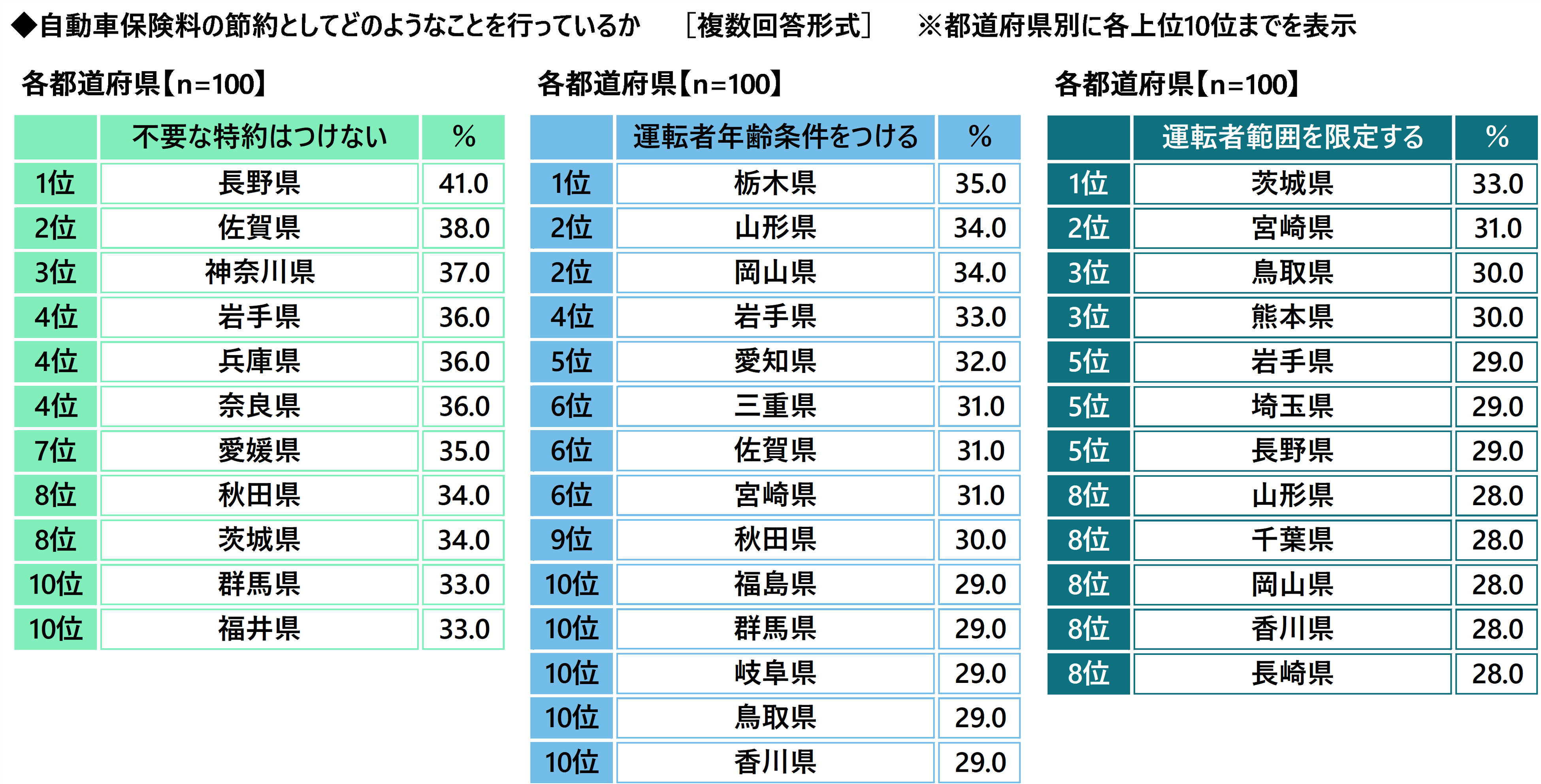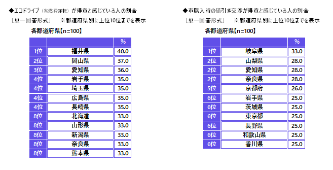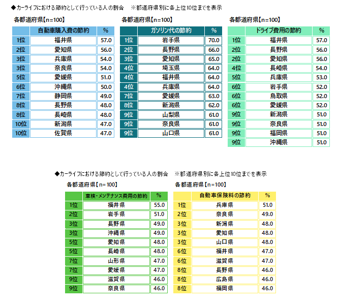 いずれも福井県が1位、「ガソリン代の節約」では岩手県、「自動車保険料の節約」では