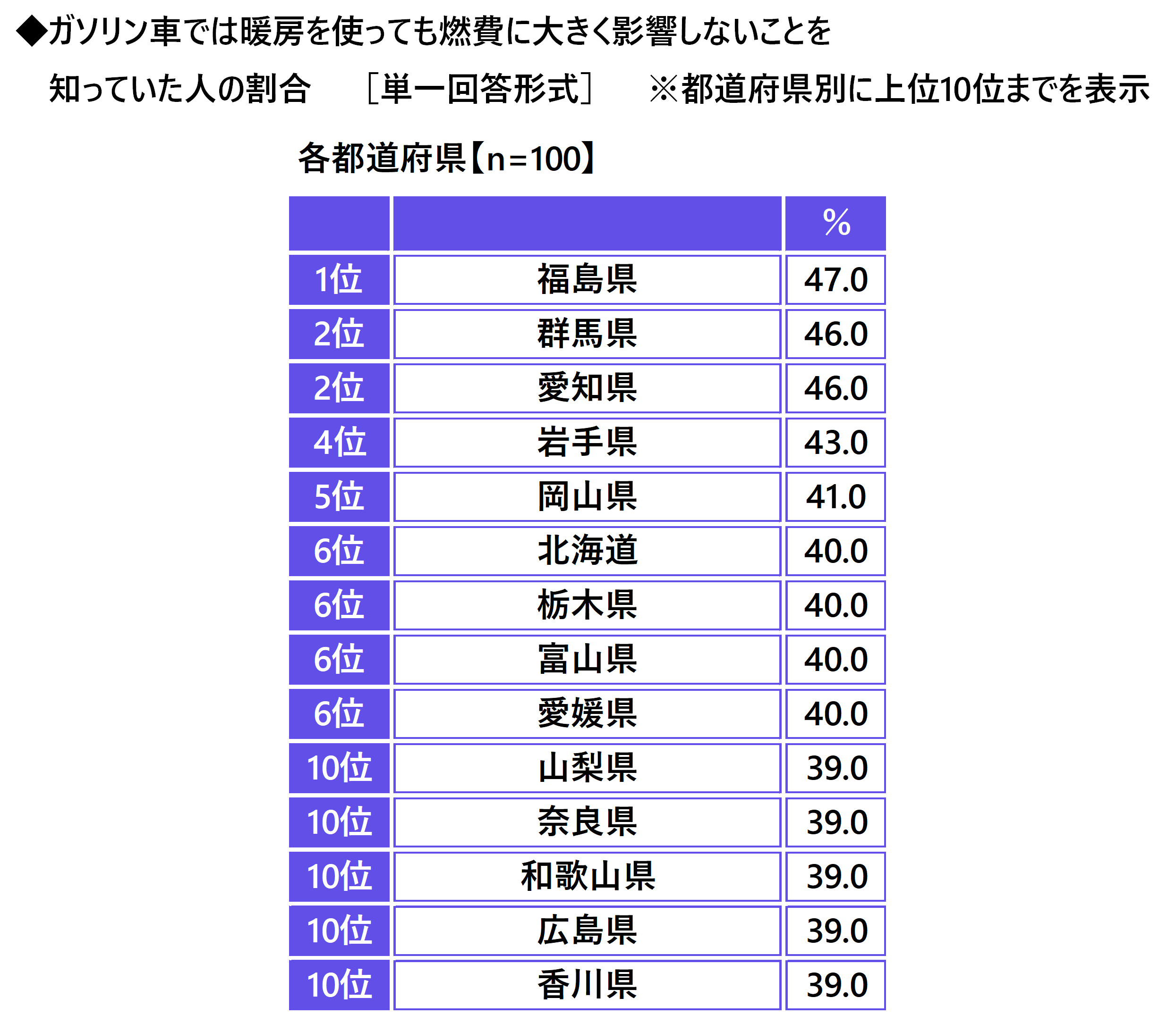 ガソリン車では暖房を使っても燃費に大きく影響しないことを知っていた人の割合を都道府県別にみると、1位は福島県(47.0%)、2位は群馬県と愛知県(いずれも46.0%)となりました。