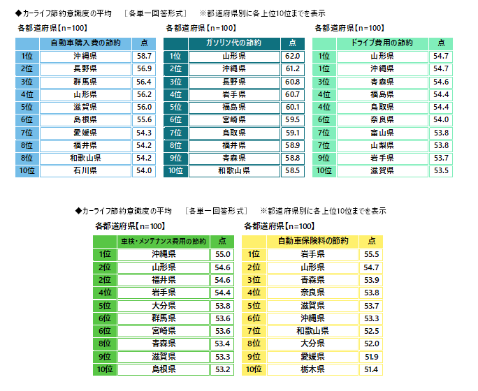 それぞれの項目について自己評価の平均を都道府県別にみると、【自動車購入費の節約】では1位は沖縄県(58.7点)、2位は長野県(56.9点)、3位は群馬県(56.4点)、【ガソリン代の節約】では1位は山形県(62.0点)、2位は沖縄県(61.2点)、3位は長野県(60.8点)、【ドライブ費用の節約】では1位は山形県と沖縄県(いずれも54.7点)、3位は青森県(54.6点)、【車検・メンテナンス費用の節約】では1位は沖縄県(55.0点)、2位は山形県と福井県(いずれも54.6点)、【自動車保険料の節約】では1位は岩手県(55.5点)、2位は山形県(54.7点)、3位は青森県(53.9点)でした。
