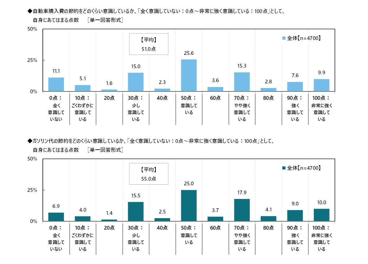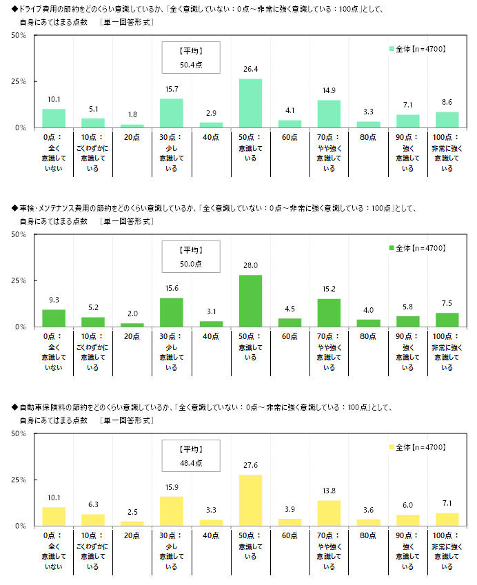 次に、カーライフにおける節約をどのくらい意識しているか、「全く意識していない:0点~非常に強く意識している:100点」として、節約意識度の自己評価を聞いたところ、【自動車購入費の節約(例:中古車を選ぶ、軽自動車を選ぶ、値引き交渉するなど)】では「50点:意識している」(25.6%)に最も多くの回答が集まったほか、「30点:少し意識している」(15.0%)や「70点:やや強く意識している」(15.3%)にも回答が集まり、平均は51.0点でした。その他の項目でも同様の傾向がみられ、自己評価の平均をみると、【ガソリン代(EVの場合は充電代)の節約(例:安いガソリンスタンドを利用する、エコドライブ(省燃費運転)を心がける、エアコンの使用を控えるなど)】では55.0点、【ドライブ費用の節約(例:高速道路の利用を控える、高速道路は割引がある時間帯に利用する、安い駐車場を利用するなど)】では50.4点、【車検・メンテナンス費用の節約(例:安い整備工場を利用する、こまめにメンテナンスする、洗車は自分でするなど)】では50.0点、【自動車保険料の節約(例:安い保険に切り替える、補償内容を見直すなど)】では48.4点でした。