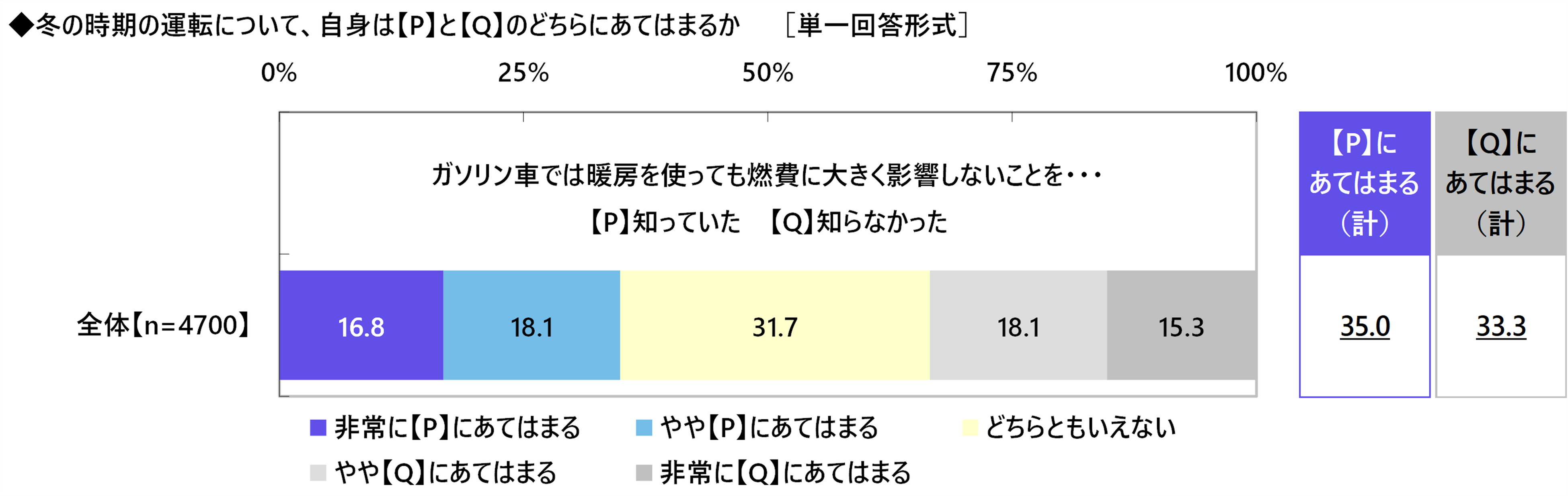 冬の時期の運転について、自身はどちらにあてはまるか聞いたところ、≪ガソリン車では暖房を使っても燃費に大きく影響しないことを…知っていた 知らなかった≫では、『知っていた(計)』は35.0%、『知らなかった(計)』は33.3%、「どちらともいえない」は31.7%となりました。ガソリン車の暖房については、エンジンの排熱を利用しているため、燃費にほとんど影響はしません。そのことを知っていた人は少数派のようです。