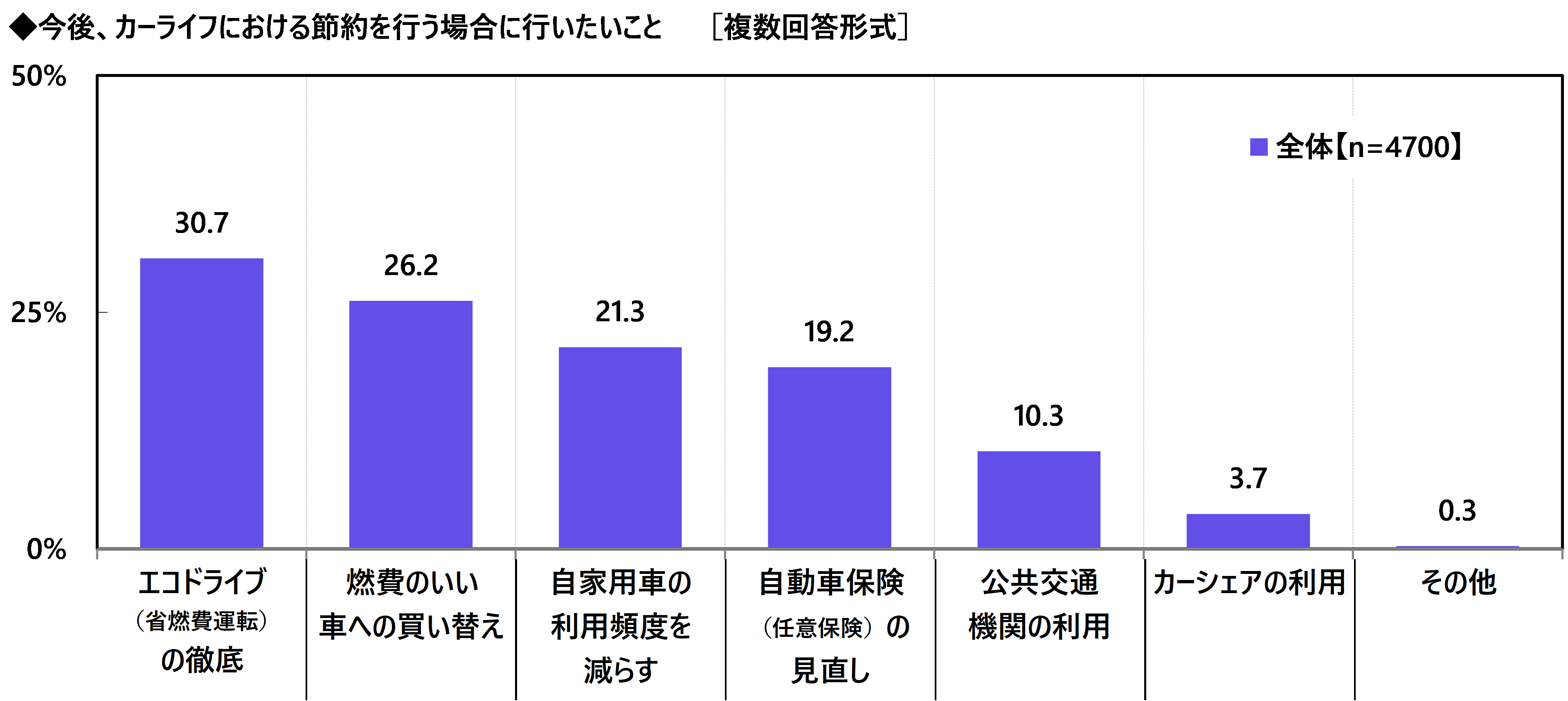 今後、カーライフにおける節約を行う場合に行いたいことを聞いたところ、「エコドライブ(省燃費運転)の徹底」(30.7%)が最も高くなり、「燃費のいい車への買い替え」(26.2%)、「自家用車の利用頻度を減らす」(21.3%)、「自動車保険(任意保険)の見直し」(19.2%)、「公共交通機関の利用」(10.3%)が続きました。