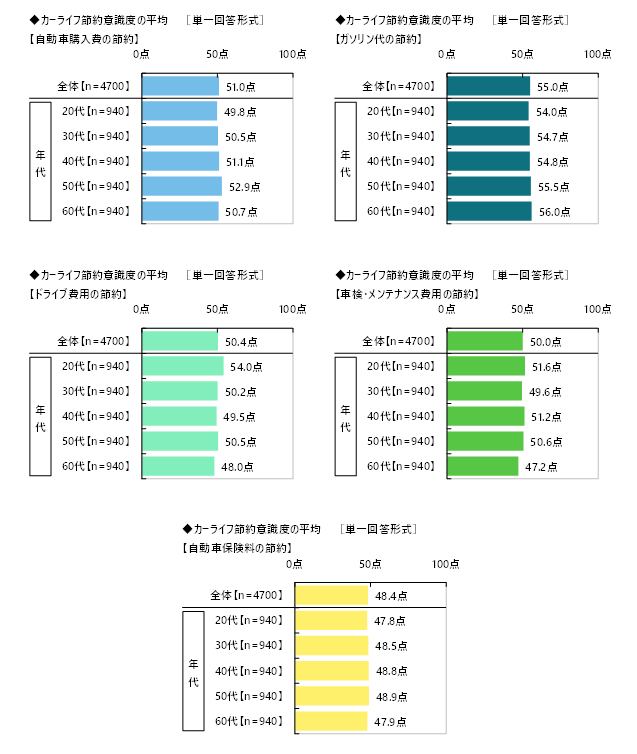 それぞれの項目について年代別にみると、自己評価の平均が最も高くなったのは、【自動車購入費の節約】では50代(52.9点)、【ガソリン代の節約】では60代(56.0点)、【ドライブ費用の節約】では20代(54.0点)、【車検・メンテナンス費用の節約】でも20代(51.6点)、【自動車保険料の節約】では50代(48.9点)でした。