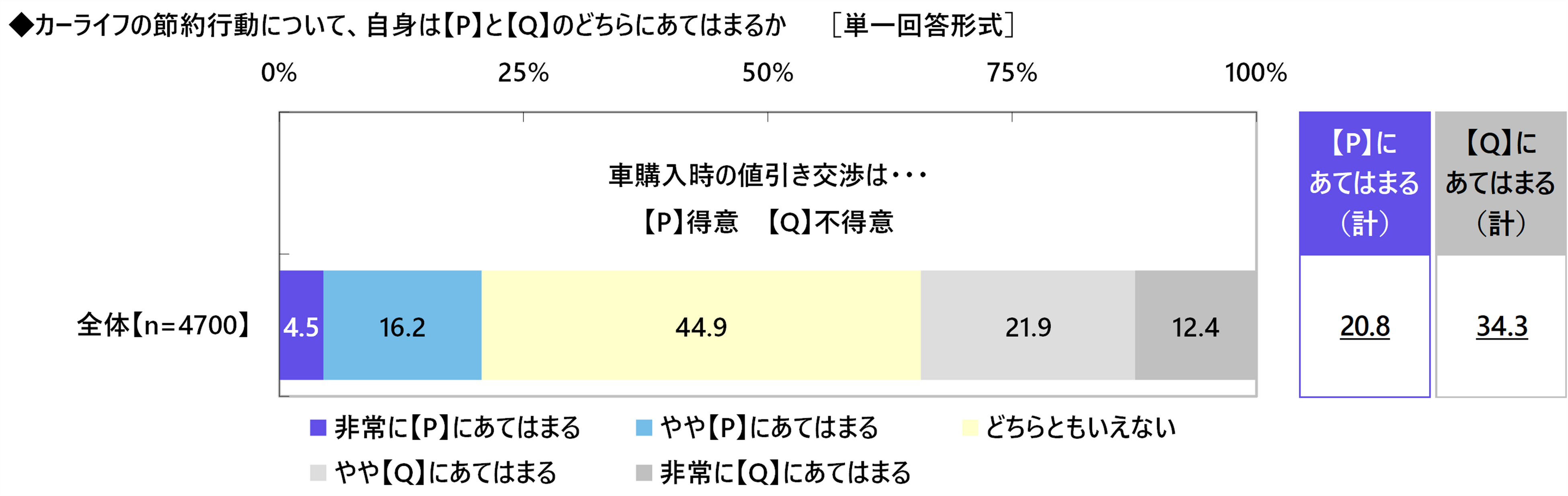 また、≪車購入時の値引き交渉は…得意 不得意≫では、『得意(計)』は20.8%、『不得意(計)』は34.3%、「どちらともいえない」は44.9%となりました。