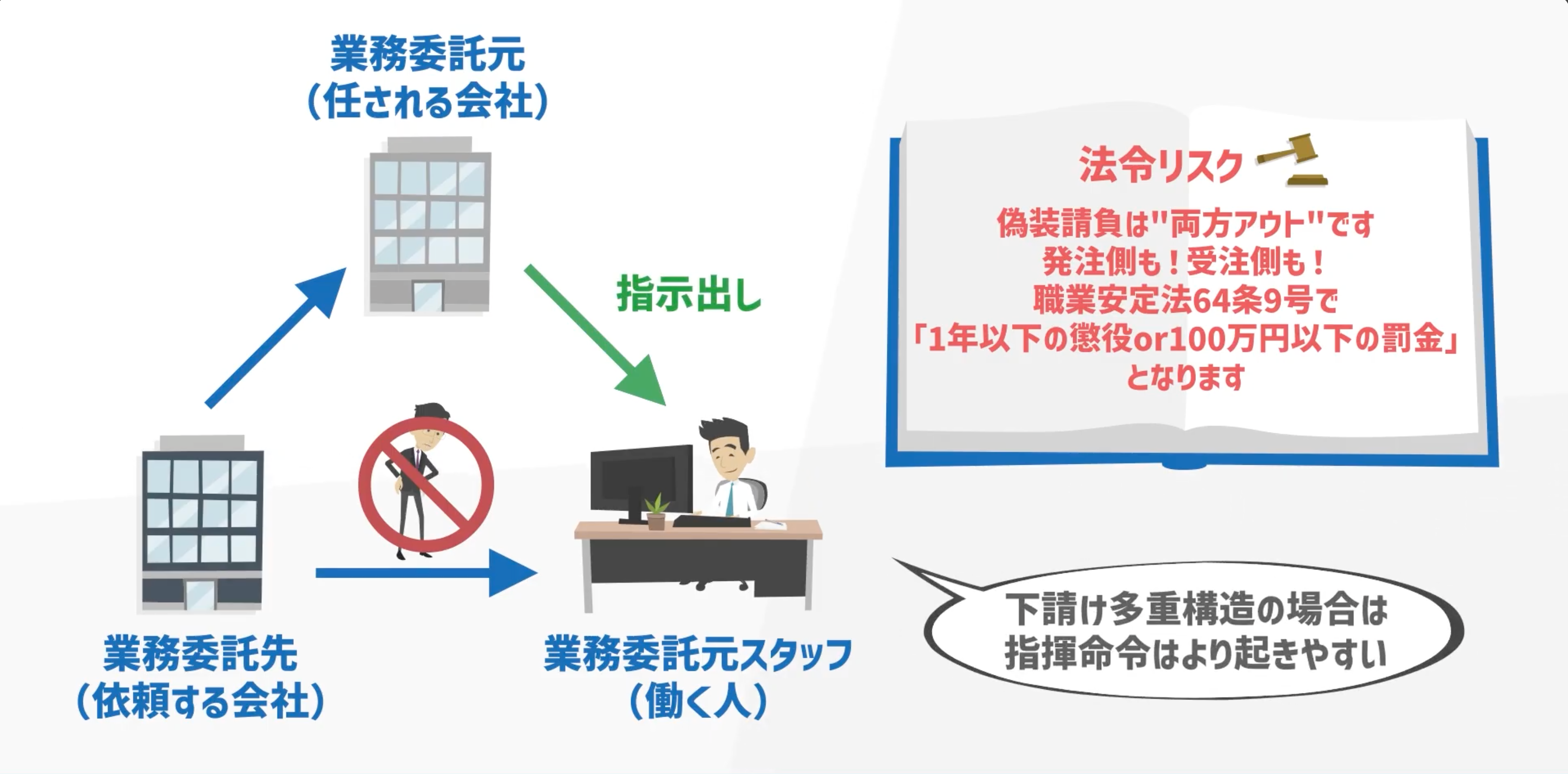 また、実態が悪質と判断された場合には、職業安定法(労働者供給事業の禁止)や労働者派遣法違反に問われ、発注者・受注者双方が刑事罰(1年以下の懲役または100万円以下の罰金)の対象となるリスクもはらんでいます。人手不足が加速し、外部人材の活用が経営戦略の要となる今、このジレンマを仕組みで解決することが急務となっています。
