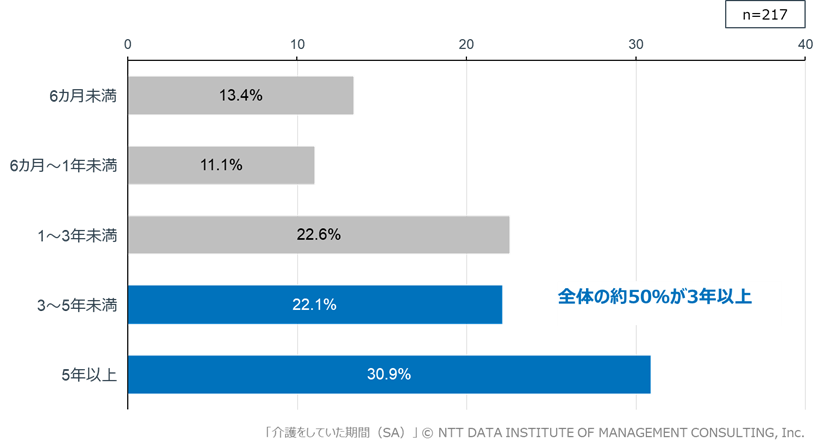 また介護経験者(n=217)を対象に介護期間を確認したところ、「5年以上」(30.9%)が最も多く、次いで「1~3年未満」(22.6%)、「3~5年未満」(22.1%)でした。全体の5割超が3年以上にわたる中長期の介護を経験しており、介護の長期化が進んでいることが明らかになりました(図表2)。