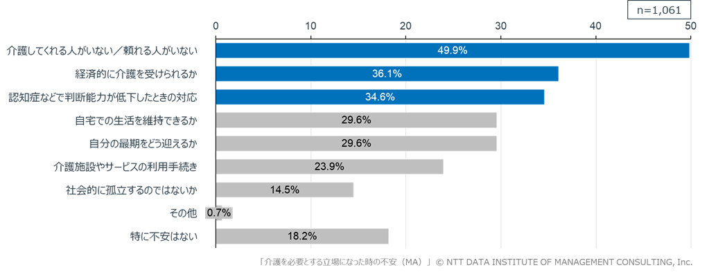 全員(n=1,061)を対象に、将来、自身が介護を必要とする立場になった場合に不安を感じる内容について確認しました(複数回答可)。その結果、「介護してくれる人がいない/頼れる人がいない」(49.9%)が最も多く、次いで「経済的に介護を受けられるか」(36.1%)、「判断能力が低下したときの対応」(34.6%)が続きました(図表6)。