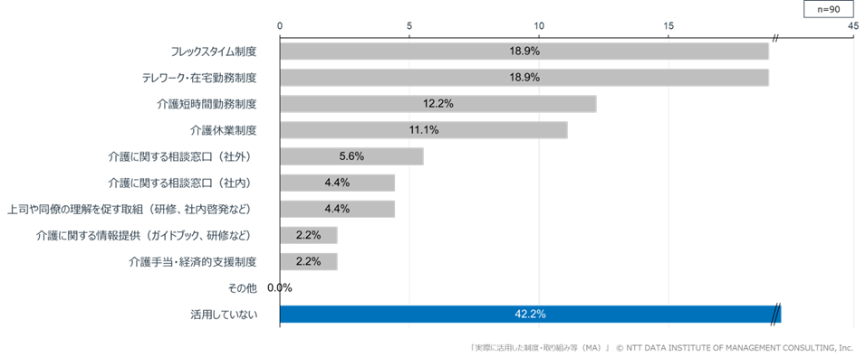 また、勤務先で制度が導入されていると回答した介護経験者(n=90)のうち、「いずれの制度も活用していない」との回答が42.2%に上り、制度整備が進む中でも、実際の利活用は限定的であることが示されました(図表4)。