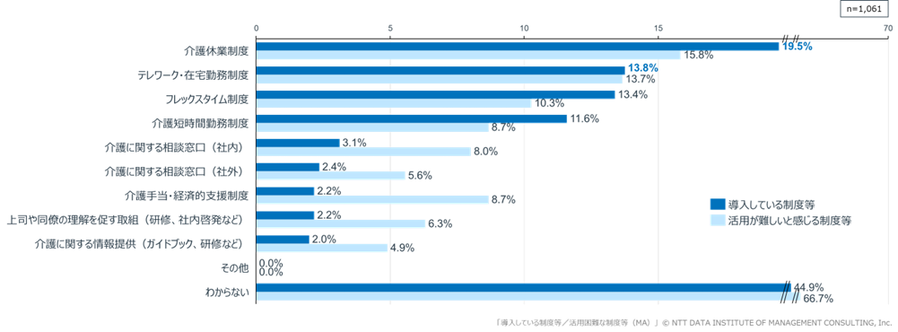 全員(n=1,061)を対象に、勤務先で導入されている「介護と仕事の両立支援制度」および制度の有無にかかわらず「活用が難しいと感じる制度」について確認しました(複数回答可)。その結果、「介護休業制度」(19.5%)や「テレワーク・在宅勤務制度」(13.8%)などの導入が一定程度進んでいる一方で、これらの制度に対して「活用が難しい」と感じる割合も同程度みられ、制度が整備されていても実際には活用しづらい実態がうかがえました(図表3)。