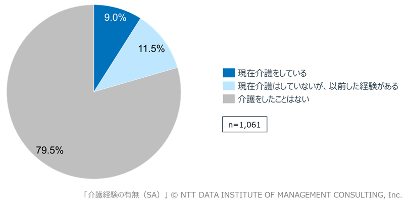 現在就労する30~60代(n=1,061、以下「全員」)を対象に、介護経験※の有無を確認しました。その結果、「現在介護をしている」人は9.0%、「現在は介護をしていないが、以前した経験がある」人は11.5%となり、両者の割合を合計した、就労しながら介護を担っている、または担ったことがある人(以下、介護経験者)が2割を超えました。「介護をしたことがない」人は79.5%でしたが、介護が身近な経験として広がりつつある実態がうかがえます(図表1)。