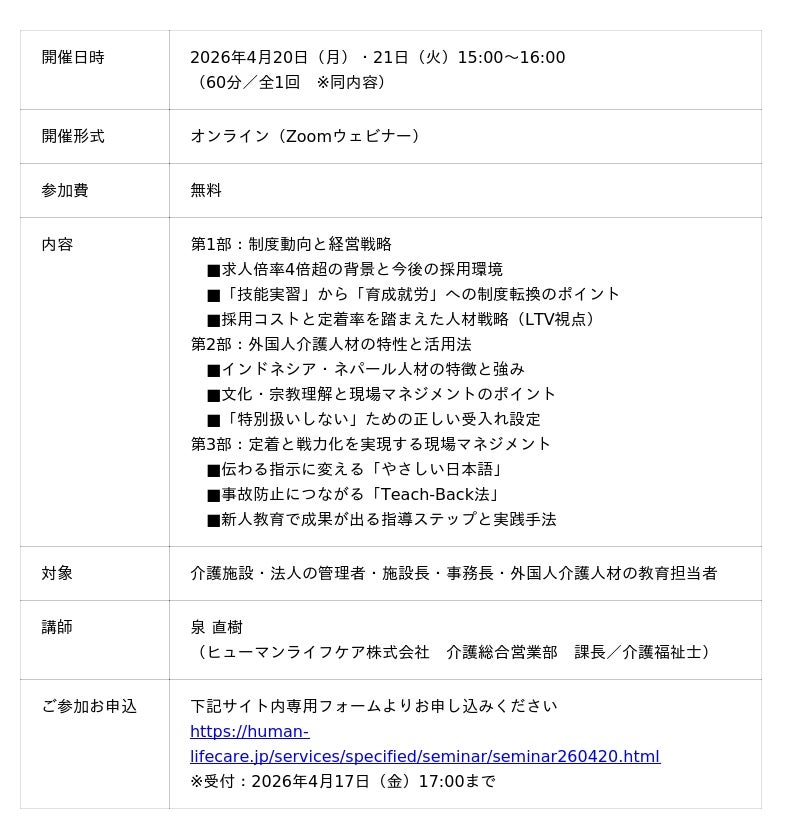 介護事業や外国人介護人材関連事業で社会課題に挑むヒューマンライフケア株式会社(本社:東京都新宿区、代表取締役:瀬戸口信也、以下「当社」)は、介護事業所の事務長・施設長向け無料オンラインセミナー「『やさしい日本語』と実践的指導で採用難を突破!外国人介護人材戦略と生産性向上のための無料オンラインセミナー」を、2026年4月20日(月)・21日(火)に開催いたします。