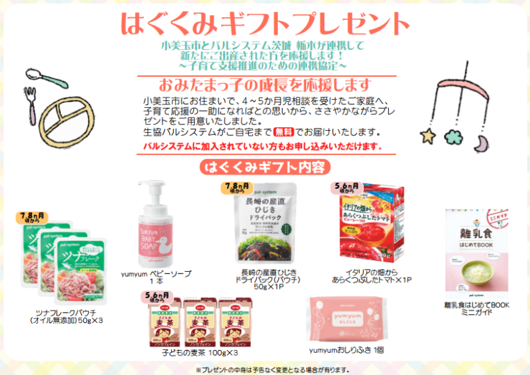 協定書に基づき各行政は、保健師や助産師による赤ちゃん訪問や乳児健診時に、出生祝いとして育児用品を詰め合わせた「おめでとうばこ」や「はぐくみギフト」の案内カードを配付します。出生祝いは、パルシステムオリジナル商品の食材やおしりふき、離乳食づくりに役立つミニガイドなどを詰め合わせます。
