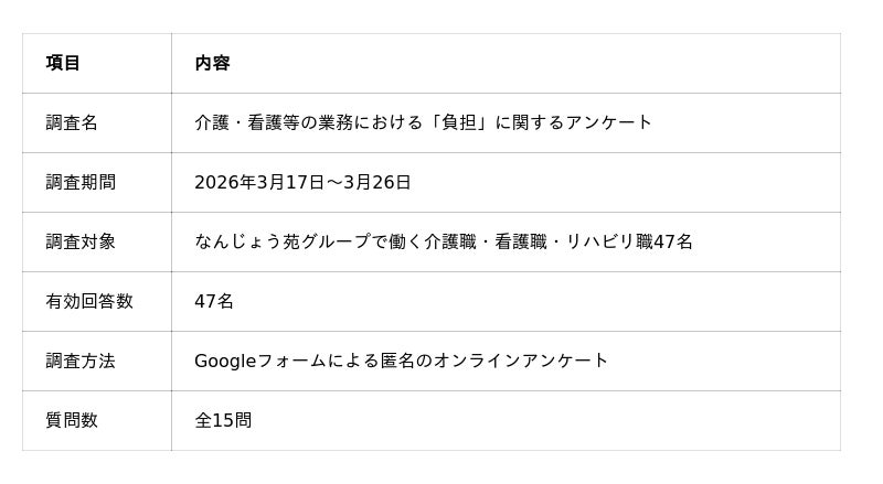 こうした制度改正を背景に、なんじょう苑グループでは「生産性向上の取り組みを現場目線で加速させること」を目的として、今回の実態調査を実施しました。単なる加算取得を目的とするのではなく、職員一人ひとりが感じるリアルな負担を把握し、「働き続けられる介護現場」の実現につなげることが本調査の本質的な目的です。